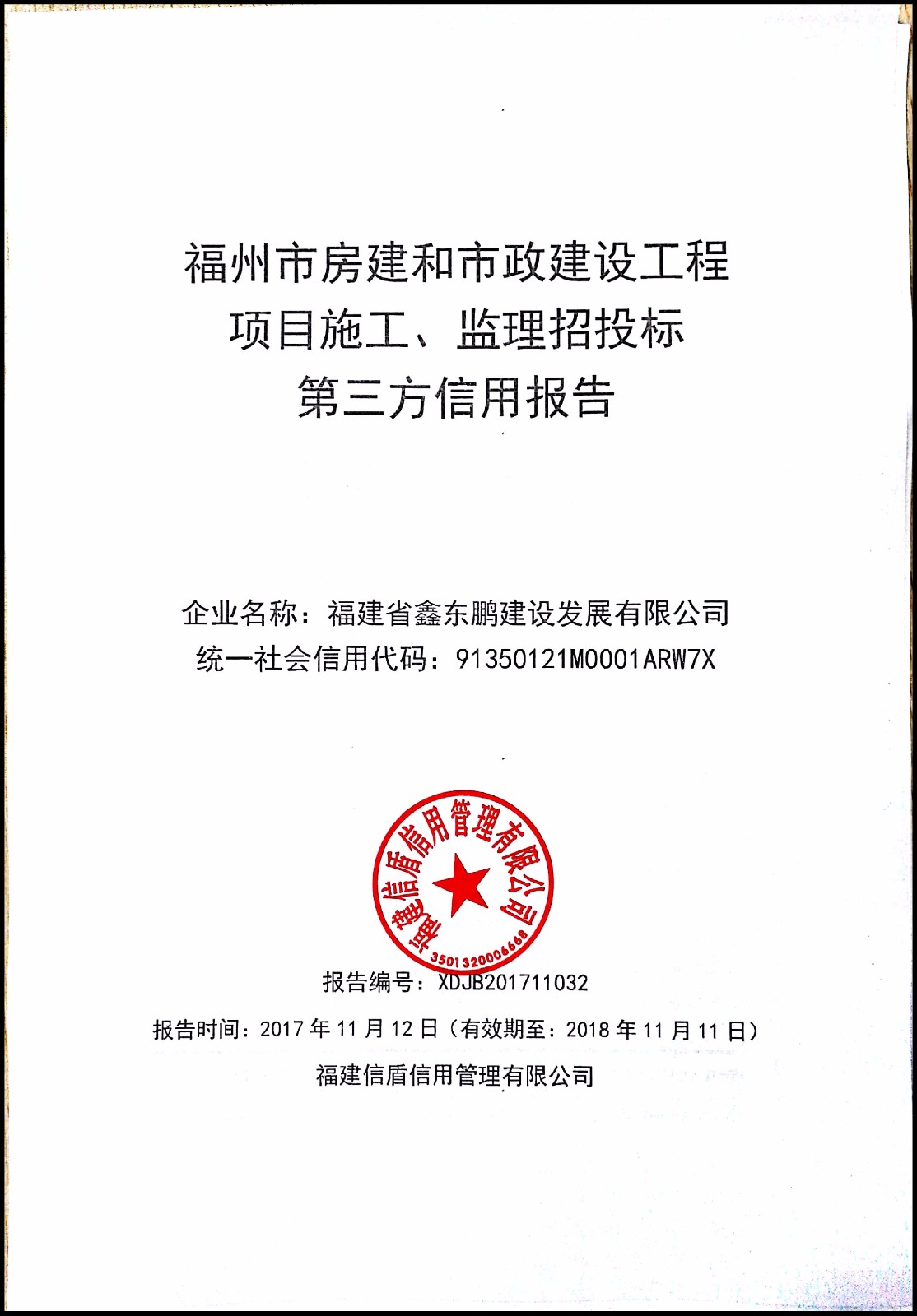 福建省鑫東鵬建設發展有限公司 XDJB201711032