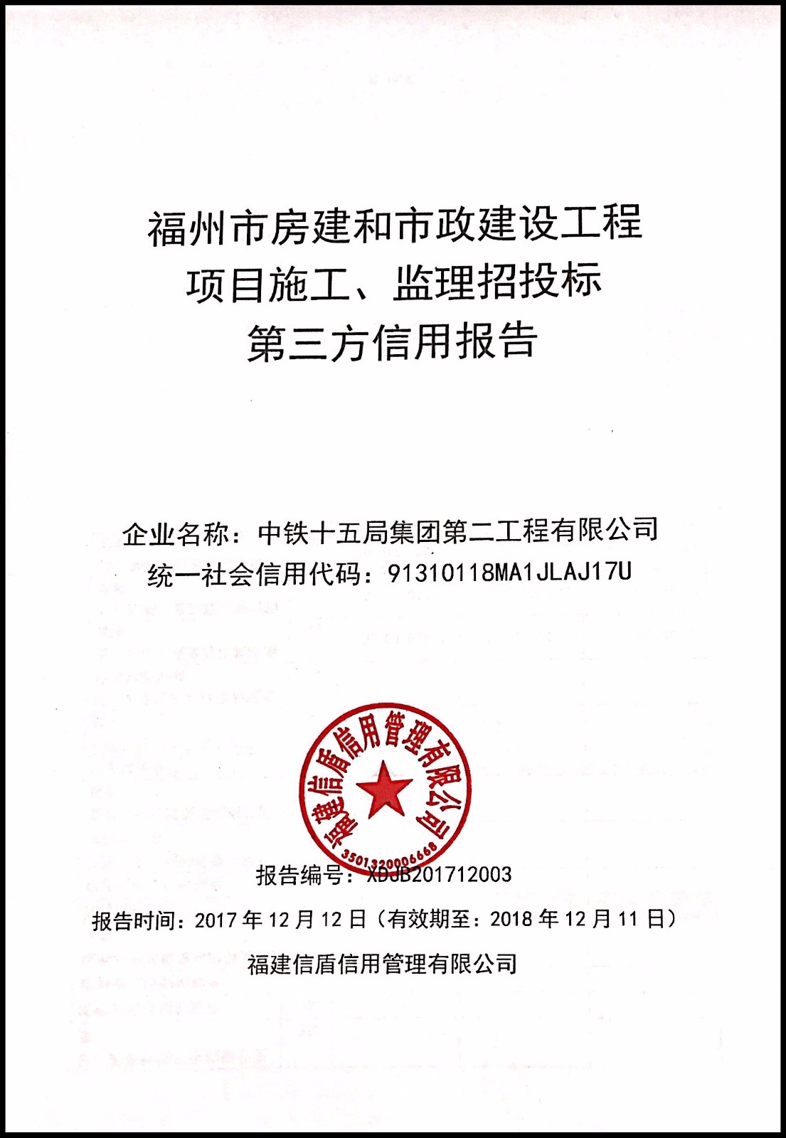 中鐵十五局集團第二工程有限公司 XDJB201712003