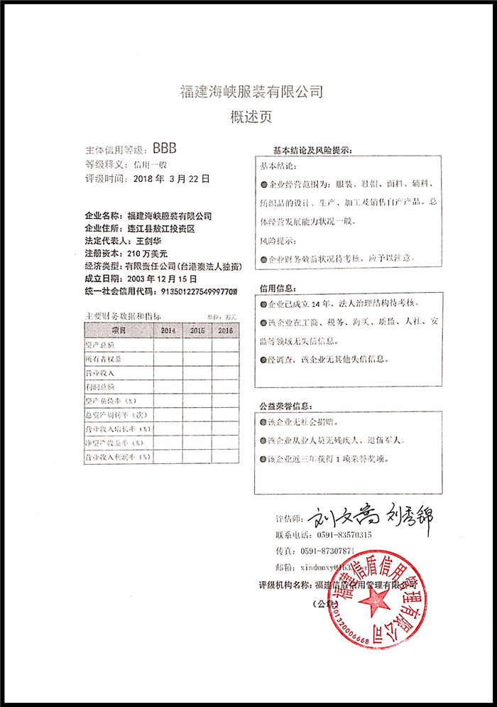 福建海峽服裝有限公司 XDPJ201803188